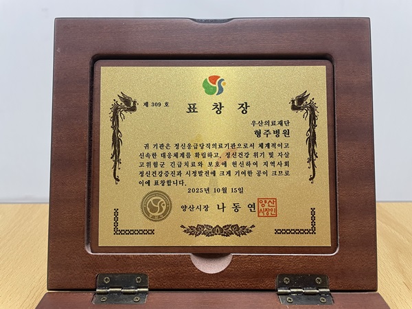 양산시장 표창장 수여(정신응급 당직 수행 우수기관 선정)