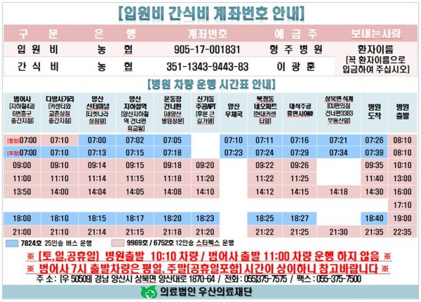 2025년 8월 18일부터 병원 차량 시간표 변경건 안내드립니다. 양산터미널 방면 출근차량이 기존보다 7분씩 앞당겨졌습니다.