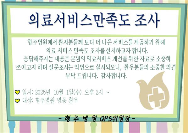 목록 2025년 의료서비스 만족도 조사 실시 일정 안내문 페이지 정보 작성자관리자 댓글0건 조회335회 작성일25.09.25 14:44 본문 - 이전글외래진료 안내(9/29~12/26) 25.10.10 다음글자살예방의 날 기념 보건복지부 장관 표창 수상 25.09.22 댓글 0 댓글목록 등록된 댓글이 없습니다.