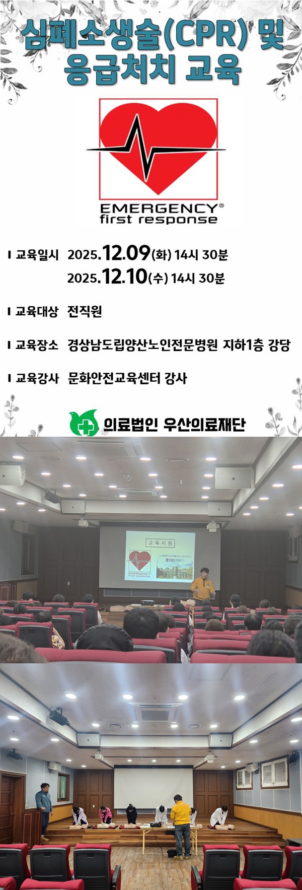 목록 심폐소생술 및 응급처치 교육 실습 장면 페이지 정보 작성자관리자 댓글0 조회346 작성일25.12.09 16:07 본문 ♥ 심폐소생술 및 응급처치 교육 실습 장면 ♥ 이전글감염관리 캠페인(손위생 체험활동) 25.12.12 다음글양산시중독관리통합지원센터 기관방문(하반기) 25.11.24 Comment 0 댓글목록 등록된 댓글이 없습니다.