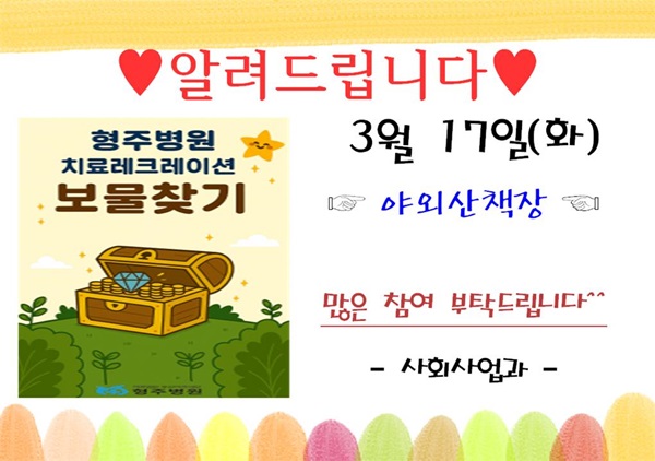 목록 보물찾기 미니이벤트 안내문 페이지 정보 작성자관리자 댓글0 조회43 작성일26.03.06 14:50 본문 - 이전글3월 야외산책장 개방 26.03.09 다음글야외산책장 개방 26.03.06 Comment 0 댓글목록 등록된 댓글이 없습니다.