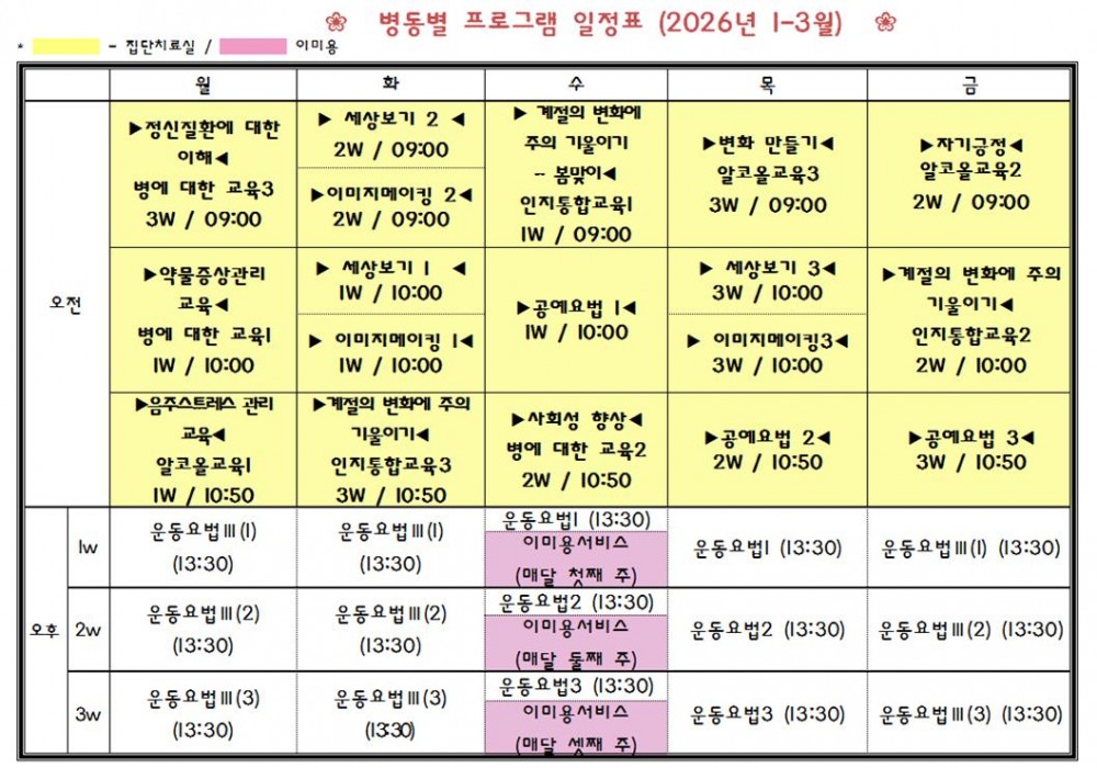 목록 병동별 프로그램 일정표 (2026년 1~3월) 페이지 정보 작성자관리자 댓글0 조회81 작성일25.12.29 14:27 본문 - 다음글병동별 프로그램 일정표 (2025년 10~12월) 25.09.30 Comment 0 댓글목록 등록된 댓글이 없습니다.