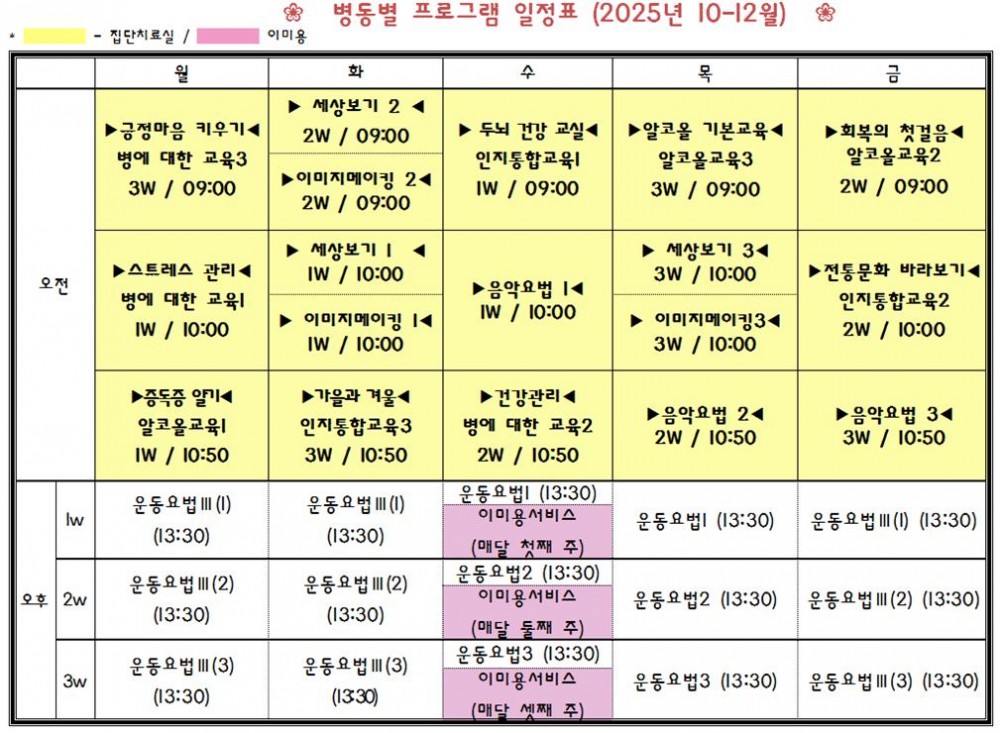 목록 병동별 프로그램 일정표 (2025년 10~12월) 페이지 정보 작성자관리자 댓글0 조회156 작성일25.09.30 15:51 본문 - 이전글병동별 프로그램 일정표 (2026년 1~3월) 25.12.29 다음글병동별 프로그램 일정표 (2025년 7~9월) 25.06.30 Comment 0 댓글목록 등록된 댓글이 없습니다.